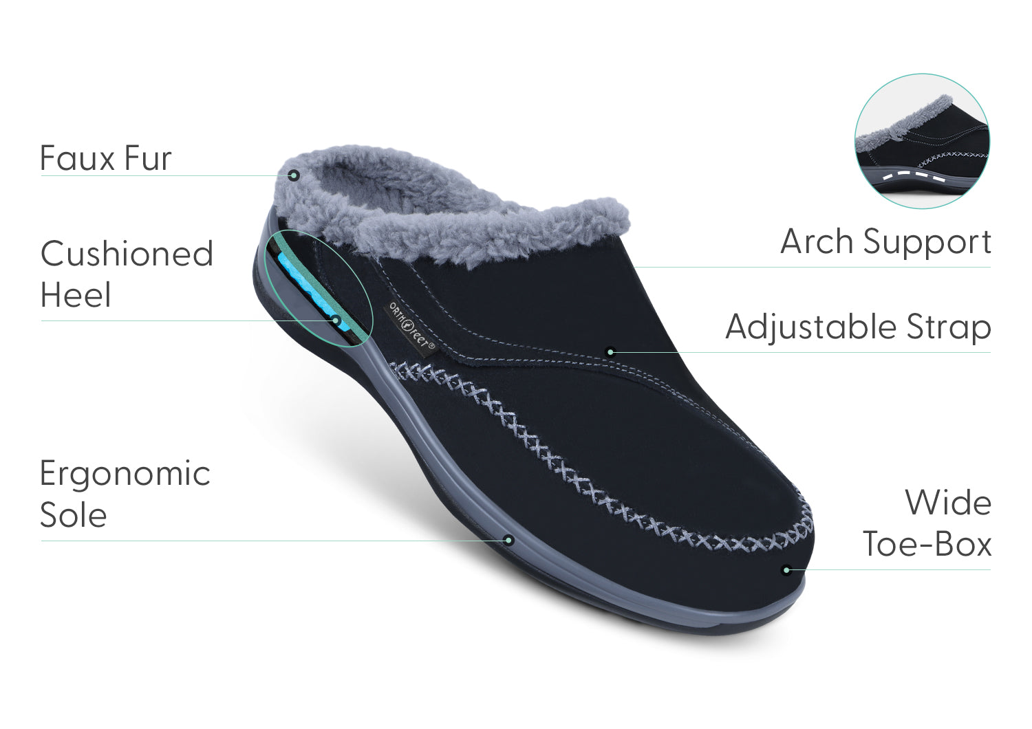 The adjustable side strap on this suede slip-on slipper opens wide to welcome feet into faux fur-lined luxury, with a heel lip that helps keep them on. Under the cozy warmth is full-foot cushioning and pain-relieving support of the Ortho-Cushion™ System. Charlotte's roomy toe box keeps the pressure off sensitive conditions and allows feet to move freely, all around the house